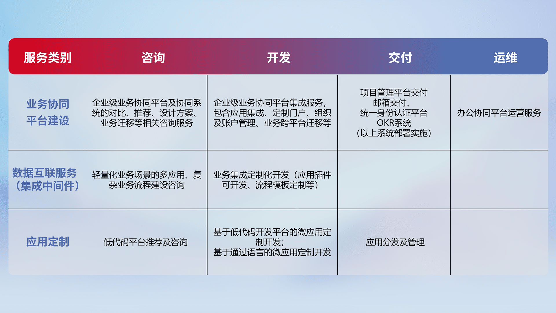 针对钉钉、、企微、、IDaas等平台级产品提供产品的规划、、方案、、、交付、、、定制化开发等服务,,实现如统一协同办公、、、智能客户服务、、、混合会议管理、、、智能数据查询、、等业务场景,,,,实现数字化转型。。。。